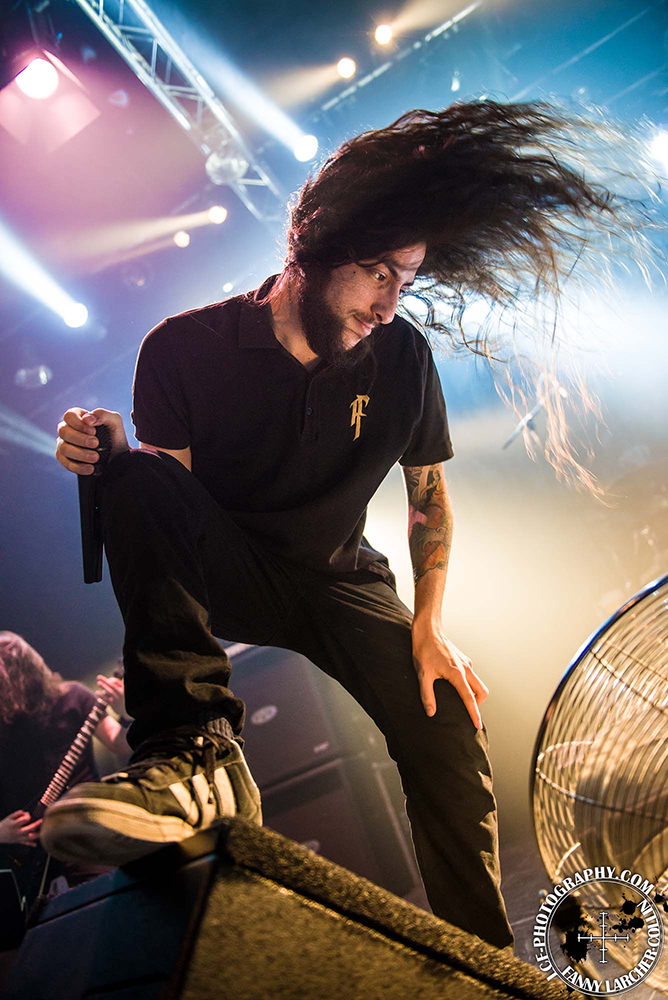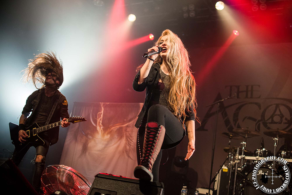 THE AGONIST s’installe sur une scène à l’effigie de son nouvel album « Eye Of The Providence ». La salle est plutôt froide et le public est loin d’être arrivé en masse, à peine une centaine de personnes mais toutes motivées pour écouter les Canadiens. THE AGONIST présente ce soir sa nouvelle chanteuse Vicky : son style se rapproche de celui d’Alyssa, pas de grand bouleversement vocal mais sa jeunesse se ressent et la frontwoman manque d’assurance. Il lui faudra quelques tournées pour s’affirmer sur scène et lâcher sa voix encore trop en retrait par rapport à la puissance que nécessite THE AGONIST. La bonne surprise vient du chant clair qui est simple et posé, sans excès.