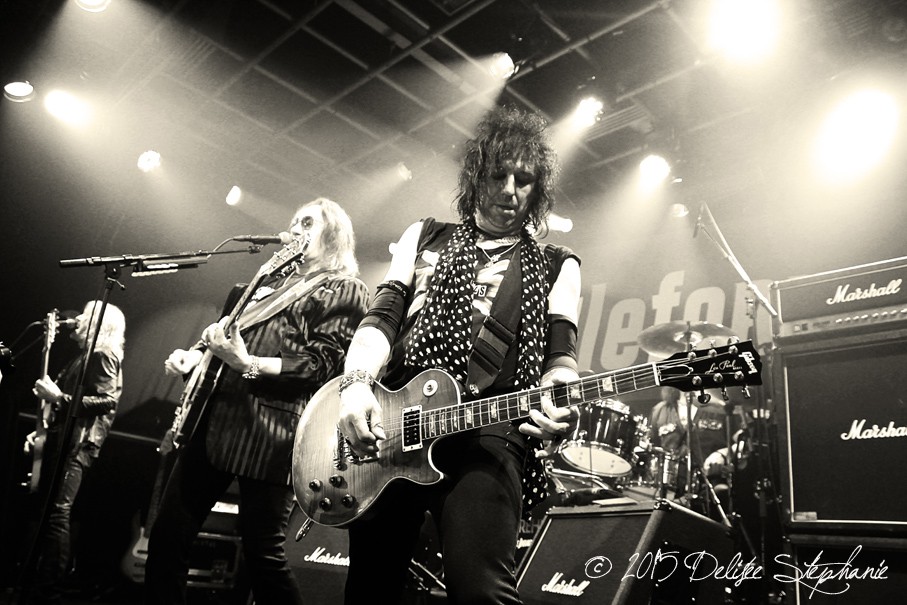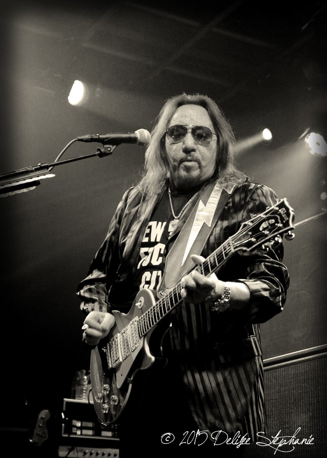 La set-list du groupe est un mélange homogène du répertoire solo d’Ace Frehley, toutes périodes confondues, et de KISS grande époque. Les premières notes de « Fractured Mirror » résonnent en introduction dans la salle en ébulition. Le groupe ouvre avec le titre « Rocket Ride » et le public est d’emblée ravi. Ace envoie des tonnes de médiators aux fans des premiers rangs pendant les premiers morceaux ! Deux extraits du dernier album en date, « Space Invaders », sont ensuite joués : « Gimme a Feelin’ », le premier single et « Toys » qui passent l’épreuve live haut la main. Puis, c’est au tour de « Parasite », les souvenirs pleuvent, les fans sont hyper-heureux dès les premières lignes musicales. Le groupe enchaîne sur « Love Gun » avec une interprétation vocale magistrale de Scot Coogan qui rappelle le Paul Stanley des seventies, les yeux fermés. Impressionnant. « BreakOut », un titre de l’album « Frehley’s Comet » co-écrit avec Richie Scarlet à l’époque, est interprété par le guitariste, aux faux airs de Keith Richards, à la voix rocailleuse et à l’attitude glam-rock des années 1970. Retour au dernier album solo avec le titre éponyme pour enchaîner sur la reprise des ROLLING STONES « 2000 Man » puis « Strutter » issu du premier album de KISS avec Scot Coogan à la voix, Paul Stanley-Like, qui rappelle, encore une fois, la belle époque des super héros du hard rock ! Ovation.