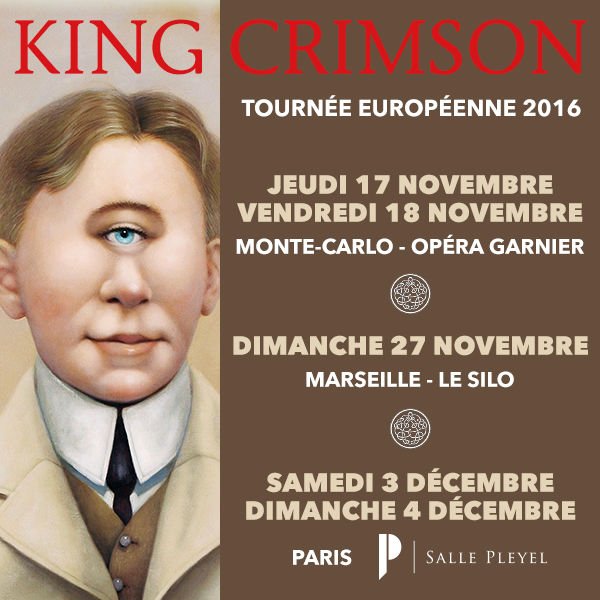 KING CRIMSON sera en tournée du 17 novembre au 4 décembre 2016 ! Le groupe emblématique sera à l'Opéra Garnier de Monte-Carlo les 17 et 18 novembre, au Silo à Marseille le 27 novembre et à la Salle Pleyel à Paris les 3 et 4 décembre. Il présentera son dernier album « Live At The Orpheum », sorti début 2015.