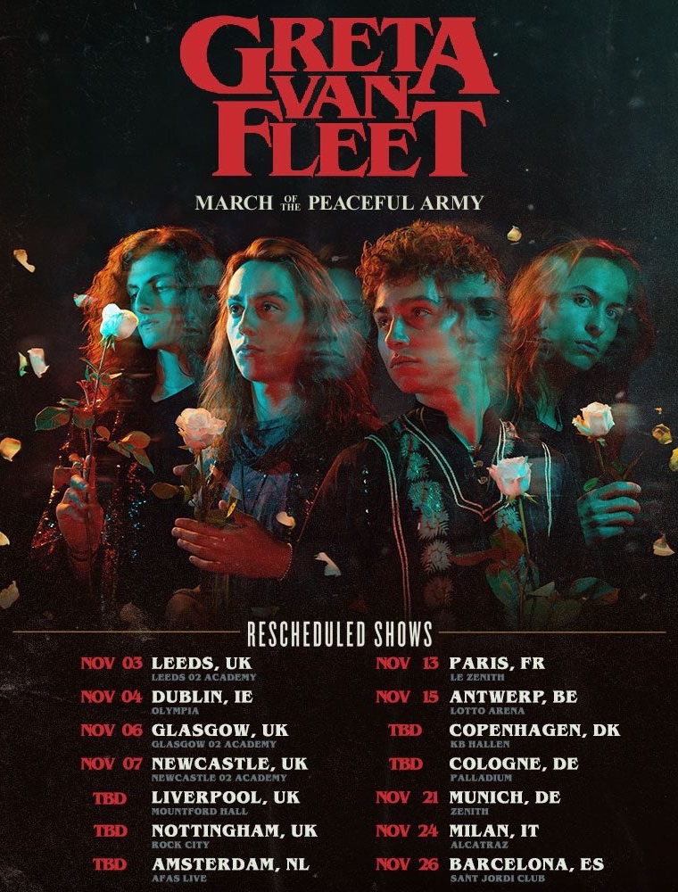 Nous avons des nouvelles sincèrement malheureuses concernant nos prochains spectacles du 22 février au 17 mars et devons annoncer leur report complet à cet automne. Un an et demi de tournées constantes qui ont été à la fois enthousiasmantes et épuisantes. Josh souffre actuellement d'une infection très sérieuse des voies respiratoires supérieures qui n'a pas encore pu être guérie. Son médecin lui a imposé un repos prolongé comme seule possibilité d'un rétablissement complet. Il est maintenant nécessaire que l'ensemble du groupe retrouve son équilibre, à la fois physiquement et mentalement. Plutôt que de continuer à offrir davantage de concerts et d’aggraver les choses, nous avons pris cette décision, afin de vous offrir le meilleur de GRETA VAN FLEET lors de notre prochaine venue. Tous les billets pour les prochains concerts du mois prochain seront valables aux dates reportées. Il suffit de conserver votre billet actuel pour assister au spectacle reporté. Des remboursements seront possibles si vous ne pouvez pas y assister. Nous sommes navrés de partager ce contretemps avec vous et espérons que vous pourrez comprendre cette décision douloureuse. (...) Chaque concert manqué aura lieu, c'est une promesse. Nous vous sommes extrêmement reconnaissants pour votre compréhension.