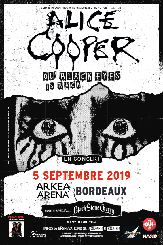 Alice Cooper sera accompagné de BLACK STONE CHERRY en 1ère partie, la billetterie est disponible sur ce lien : www.box.fr/fiche/alice-cooper