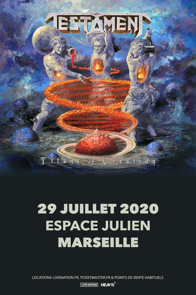 Rappelons qu'après ses deux dates en compagnie d'EXODUS et DEATH ANGEL, TESTAMENT sera de retour en France à Marseille à l'Espace Julien le 29 juillet prochain.
