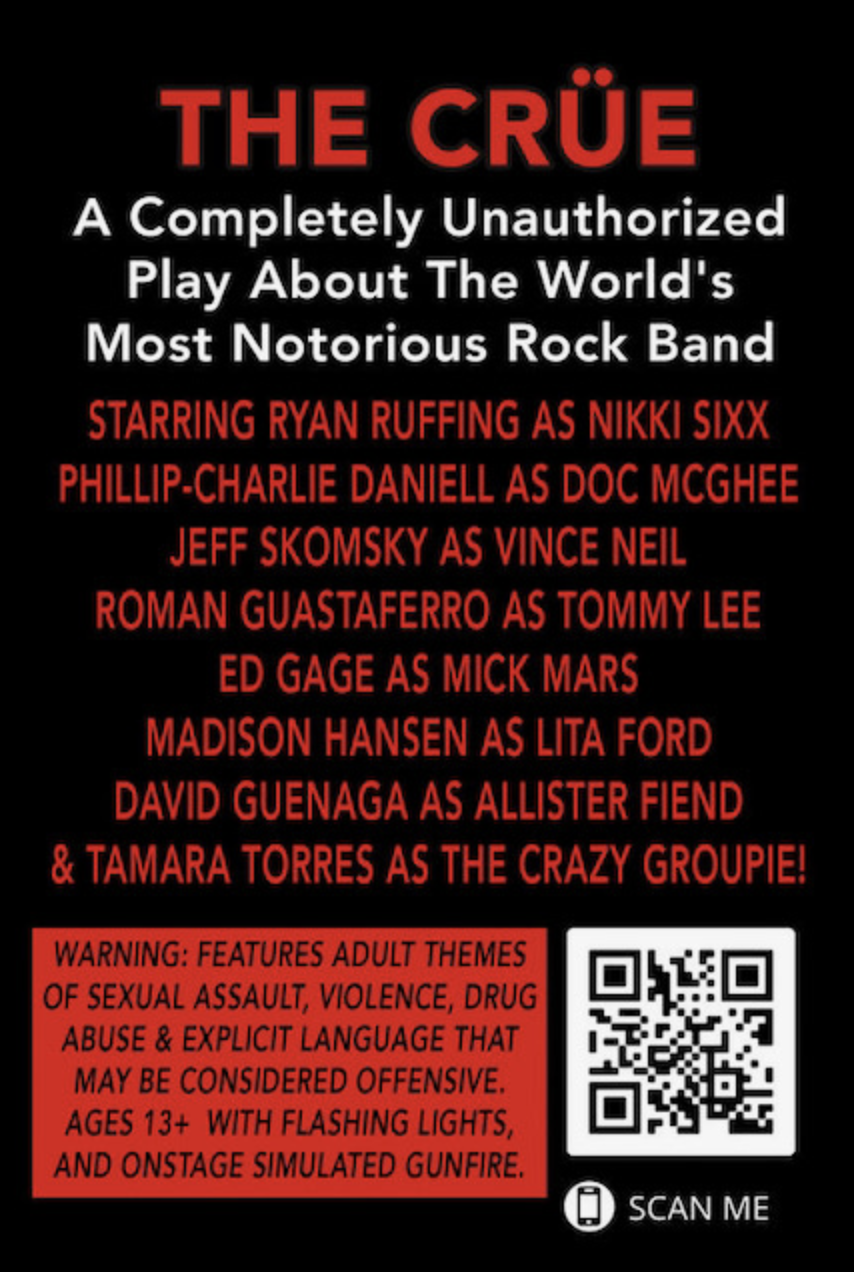 The Crüe: A Completely Unauthorized Play About The World’s Most Notorious Rock Band - Underneath The Dirt Lies The Truth!. Sous ce titre avec autant de tiroirs qu'un morceau de « ...And Justice For All » de METALLICA se cache une comédie musicale non autorisée – ce qui signifie qu'elle n'a pas reçue l'accord du groupe – consacrée à MÖTLEY CRÜE. Et plus particulièrement à Nikki Sixx, tête pensante d'un des quartets américains les plus décadents du siècle dernier.