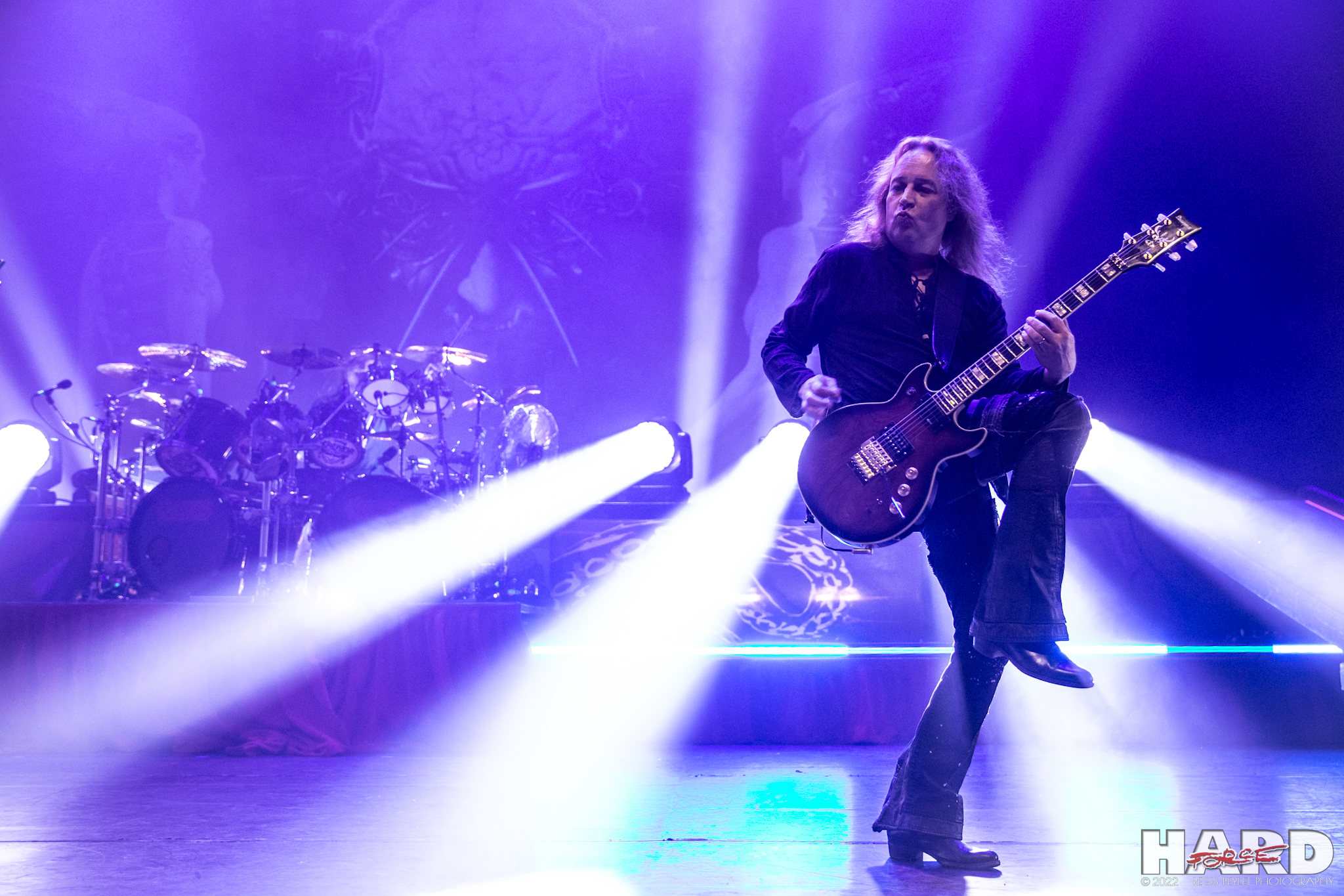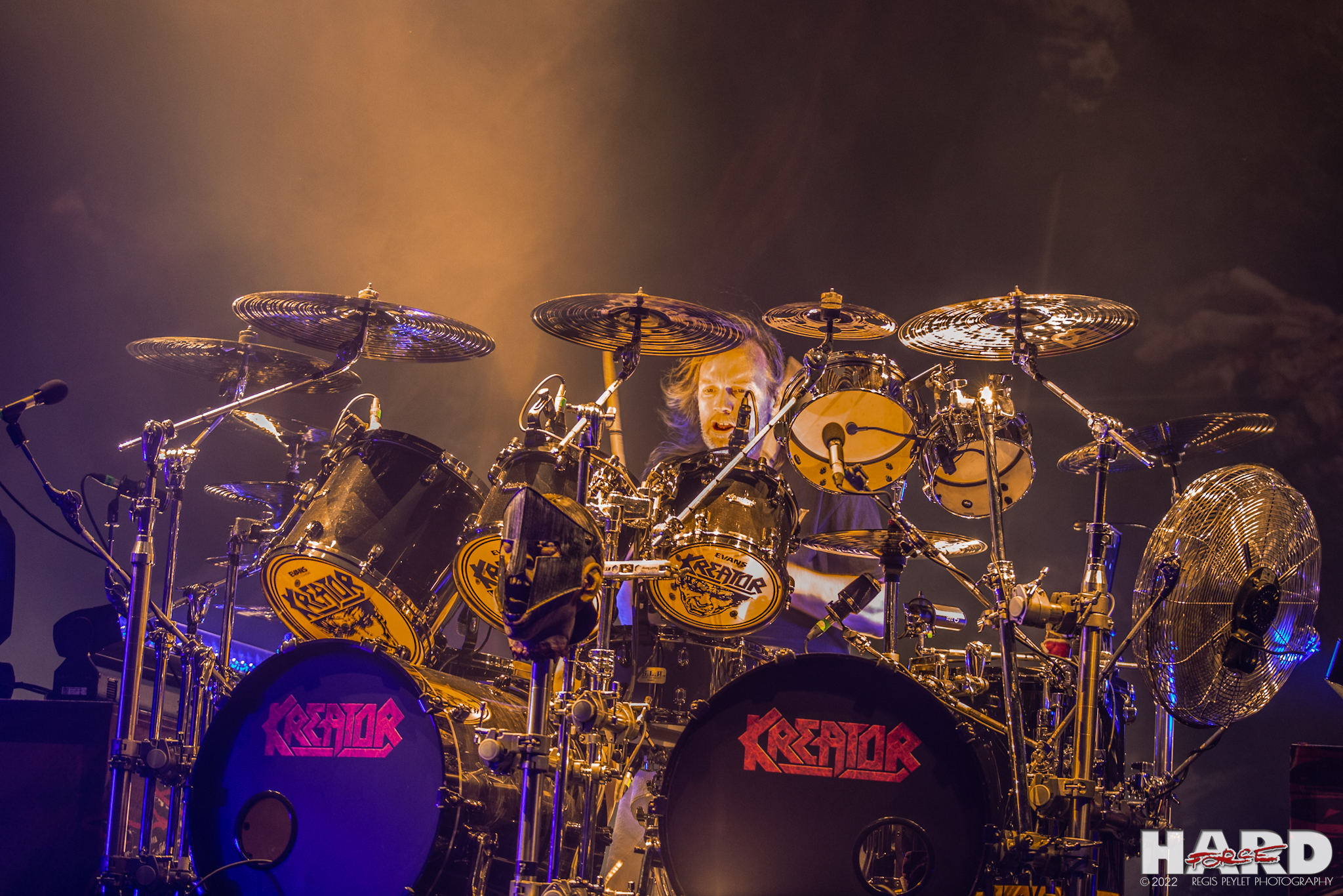 Toujours dans la force et la beauté, KREATOR nous gratifie d’un somptueux "Midnight Sun" extrait du dernier album, il s’agit d'un petit nouveau dans leur répertoire scénique. Nous assistons à un très beau duo en "metal-e-motion" avec Sofia Portanet. Moment magique qui s’éloigne des standards du groupe et qui se poursuit avec le rageur "Satan Is Real" aux si beaux décibels. Personnellement je trouve que l’agencement des 17 morceaux de ce concert est optimum. Le meilleur de chaque époque. Frédéric de son côté encourage les échauffés à reprendre avec lui les refrains. Retour aux classiques avec "Hordes Of Chaos (A Necrologue For The Elite)" qui est acclamé, suivi de l’inédit "666 - World Divided" et du désormais sacro-saint "Phantom Antichrist" qui ravive la flamme des pits. Après un fédérateur "Strongest Of The Strong", nous avons droit à une salve que l’on pourrait surnommer "et pour quelques riffs de plus". "Extreme Aggression" ou encore "People Of The Lie" pour ne citer que ces deux incontournables. Après un "Betrayer" qui n’arrange pas l’état de nos nuques, Mille et ses amis nous saluent pour un premier tomber de rideau.