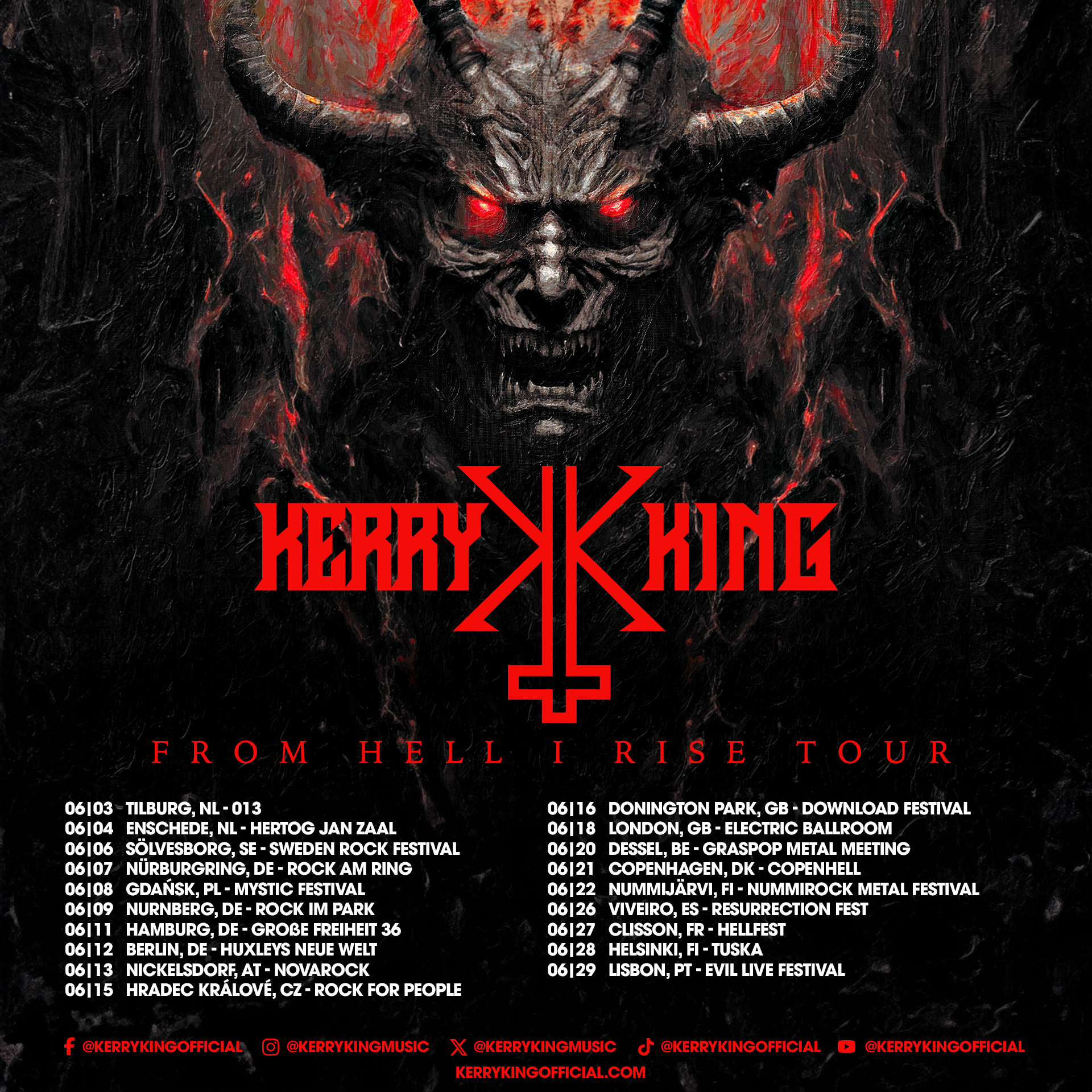 Retrouvez Kerry King au Hellfest Open Air le 27 juin. Pour ce qui est de la tournée européenne du guitariste sachez qu'en raison de problèmes logistiques, elle se terminera le 29 juin. Les remboursements pour les spectacles annulés au delà de cette date sont disponibles au point d'achat.