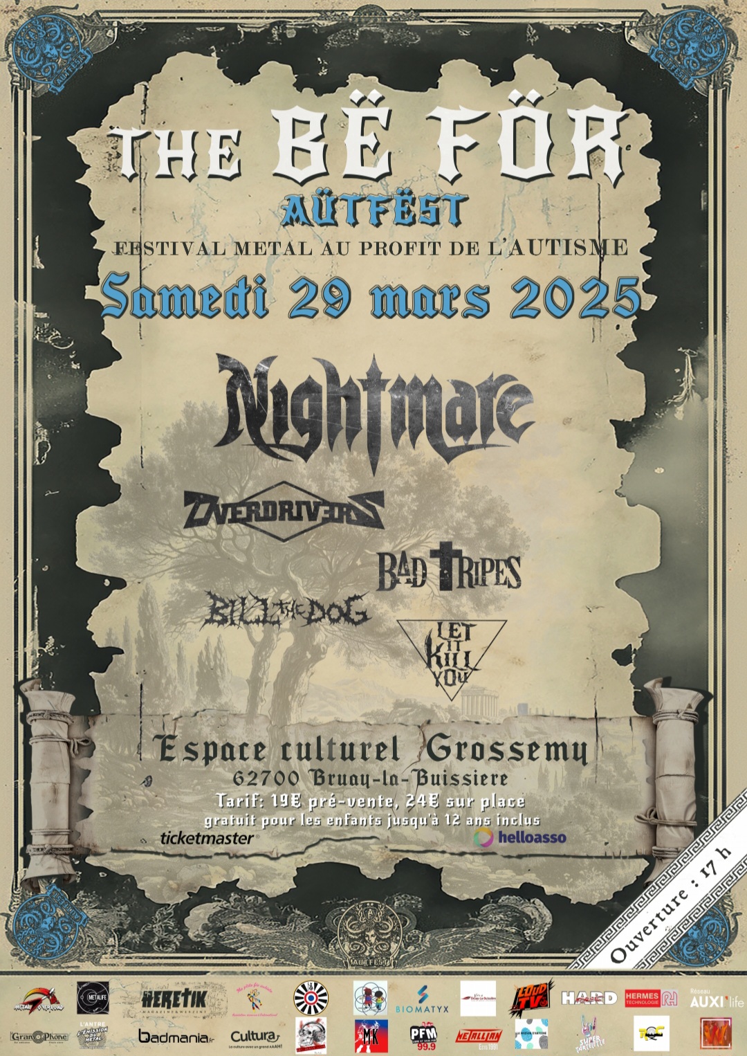 C'est donc à la Salle Grossemy de Bruay-la-Buissière, près de Béthune (62), que l'équipe du AÜTFËST vous attend pour préparer la 3e édition d'octobre avec 5 groupes dès 17h30 le 29 mars dont NIGHTMARE, OVERDRIVERS, BAD TRIPES, BILL THE DOG et LET IT KILL YOU.