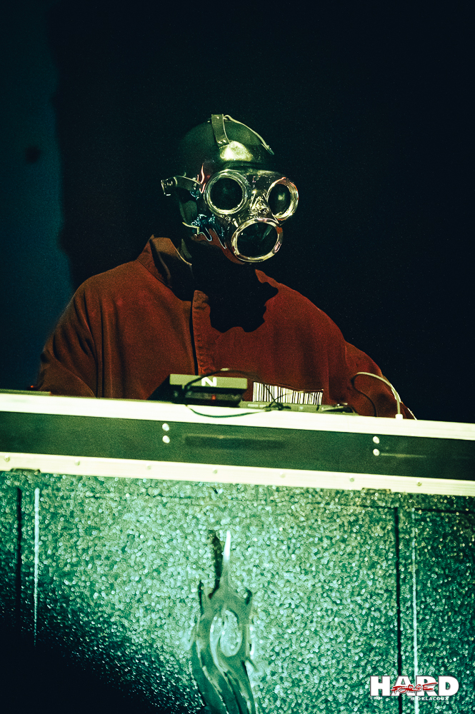 L’ambiance justement : si SLIPKNOT ne déçoit jamais en live, et qu’il est d’autant plus très présent en nos terres depuis, il a su fédérer et fidéliser son public au gré des années, celui de ce soir étant visiblement chaud bouillant et particulièrement remuant dans les deux fosses séparées de Bercy : du circle-pit spontané et des aires de pogo, il y en avait de beaux vus d’en haut. Et surtout, il a donc fallu composer avec un potentiel de chansons d’environ une heure, et ainsi créer une autre façon de les aborder, en les mettant toutes en scène, singulièrement. Si certains peuvent reprocher à Corey Taylor de meubler un peu les intermèdes avec ses déclarations en français puis en véritable langage d’amour et de gratitude envers ses fans, d’autres accusent les trop longs interludes electro qui viennent découper chaque tableau : ce soir SLIPKNOT ne vient pas enchaîner ses morceaux en déroulant l’album, il en magnifie quasiment chaque pièce en les isolant au sein d’un tissu de bidouillages et de scratches, certes en gagnant un peu de temps et en étirant quelque peu la durée du set forcément très réduite initialement, mais en cherchant à la fois à poser une ambiance indus, hip-hop et poisseuse propre à ce groupe alors si expérimental à l’heure de l’âge d’or du nu-metal. Et pour le coup, l’un des acteurs-clé de la soirée est sans conteste Sid Wilson. Avec, au civil, sa gueule cassée de crackhead digne d’un figurant dans Breaking Bad ou de taulard dealer de meth façon Ted Bundy, criminal tattoo en sus, ce nouveau venu dans le clan Osbourne fait ici office de DJ anti-DAFT PUNK sous son casque chromé. Il manie la platine avec dextérité et œuvre assez dignement dans l’habillage instrumental de la soirée, entre ambiances glauques, parasitages et drum'n'bass généreuse en infra... basses – et notamment à travers sa relecture de la piste ''Tattered & Torn''.