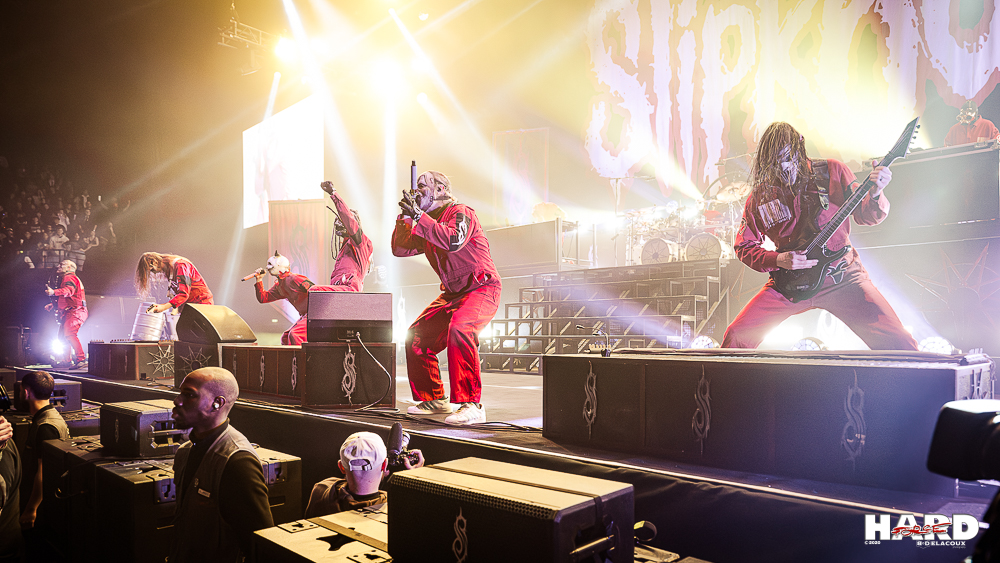 Et donc, entre chaque coloration cradingue, tantôt dansante, tantôt crispante, la set-list tant évoquée met véritablement en valeur des titres parfois plus méconnus (les morceaux-bonus ''Get This'', en début de soirée, et ''Me Inside'', le hidden-track ''Eyeore'') ou moins essentiels (''Only One'', ''No Life''), et parmi lesquels se démarquent des déflagrations tonitruantes comme ce ''Liberate'' bien vénère. Bizarrement, au bout d’un peu plus de cinquante minutes, le groupe s’absente un instant pour prétexter le jeu syndical ''du rappel'', sachant qu’il reste encore du lourd à envoyer pour qui a le track-listing (ou la set-list...) en tête : ''Spit It Out'' est évidemment très attendu comme l’un des hymnes slipknotiens originels, suivi du très agressif ''Surfacing'' à la verve particulièrement véhémente, et enfin d’une dernière pièce présentée comme ''un retour vers un endroit très sombre'', soit un ''Scissors'' lugubre, dissonant et heavy, en mode extended et donc un peu trop longuet comme ultime chapitre. Si le toujours affable Corey n’a cessé d’exprimer ses sentiments à notre égard, notre accueil et notre soutien au fil des décennies, il a toutefois quitté la scène avec ses sbires sans aucune autre dramaturgie, laissant bon nombre de fans sur leur faim. En effet, et encore une fois malgré le concept parfaitement limpide, pas mal de gens attendaient un retour ''à la normale'' avec un petit florilège de leur catalogue post-2000, avec au moins quatre-cinq morceaux en sus pour ne pas repartir avec cette sensation de concert un-peu-trop-vite-expédié-de-la-part-de-musiciens-en-mal-de-cachets-en-plein-creux-contractuel. C’est en effet ce que l’on pourrait ressentir – seulement la prestation des neuf freaks de Des Moines s’est montrée exemplaire dans l’exécution de son album number-one.