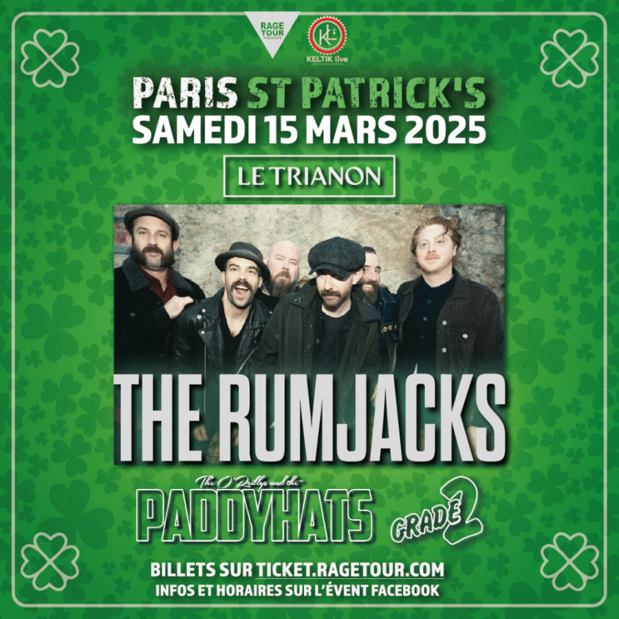 Rendez-vous ce samedi 15 mars au Trianon pour une soirée sur le thème de l’irish-punk avec THE RUMJACKS, THE O'REILLYS AND THE PADDYHATS mais aussi un peu de punk tout court avec GRADE 2 en première partie. Deux jours avant la Saint Patrick et un samedi soir, il faut admettre que ça tombe sacrément bien... d’ailleurs avec un concert quasi sold-out (quelques places encore en vente le soir sur place, à vérifier si elles sont toutes parties), apparemment je ne suis pas la seule à m’être fait la réflexion.