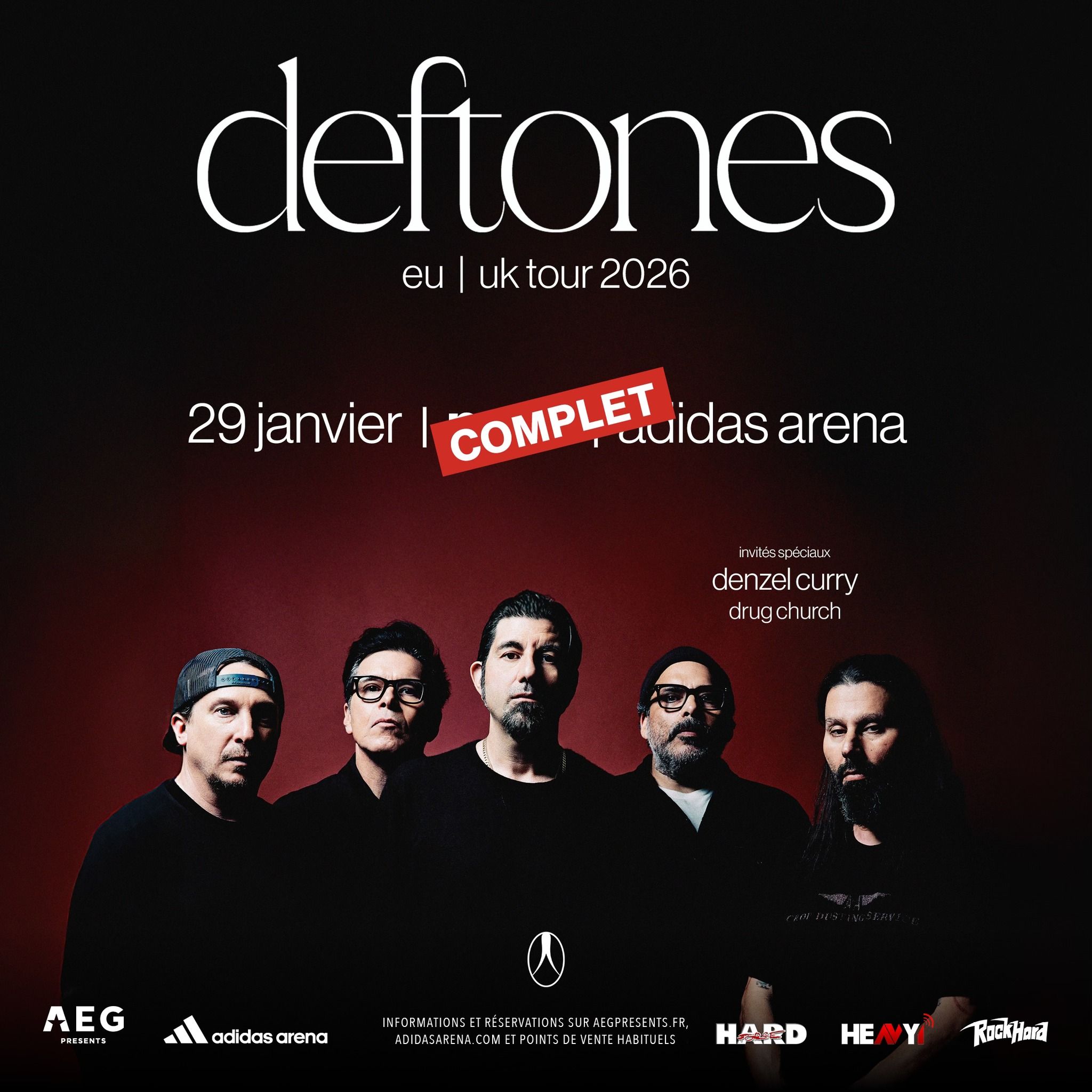 DEFTONES entamera une tournée européenne début 2026, avec notamment un concert à Paris, l'Adidas Arena le 29 janvier, désormais complet. Le rappeur américain Denzel Curry et le groupe de post-hardcore DRUG CHURCH ont déjà été confirmés comme invités spéciaux.