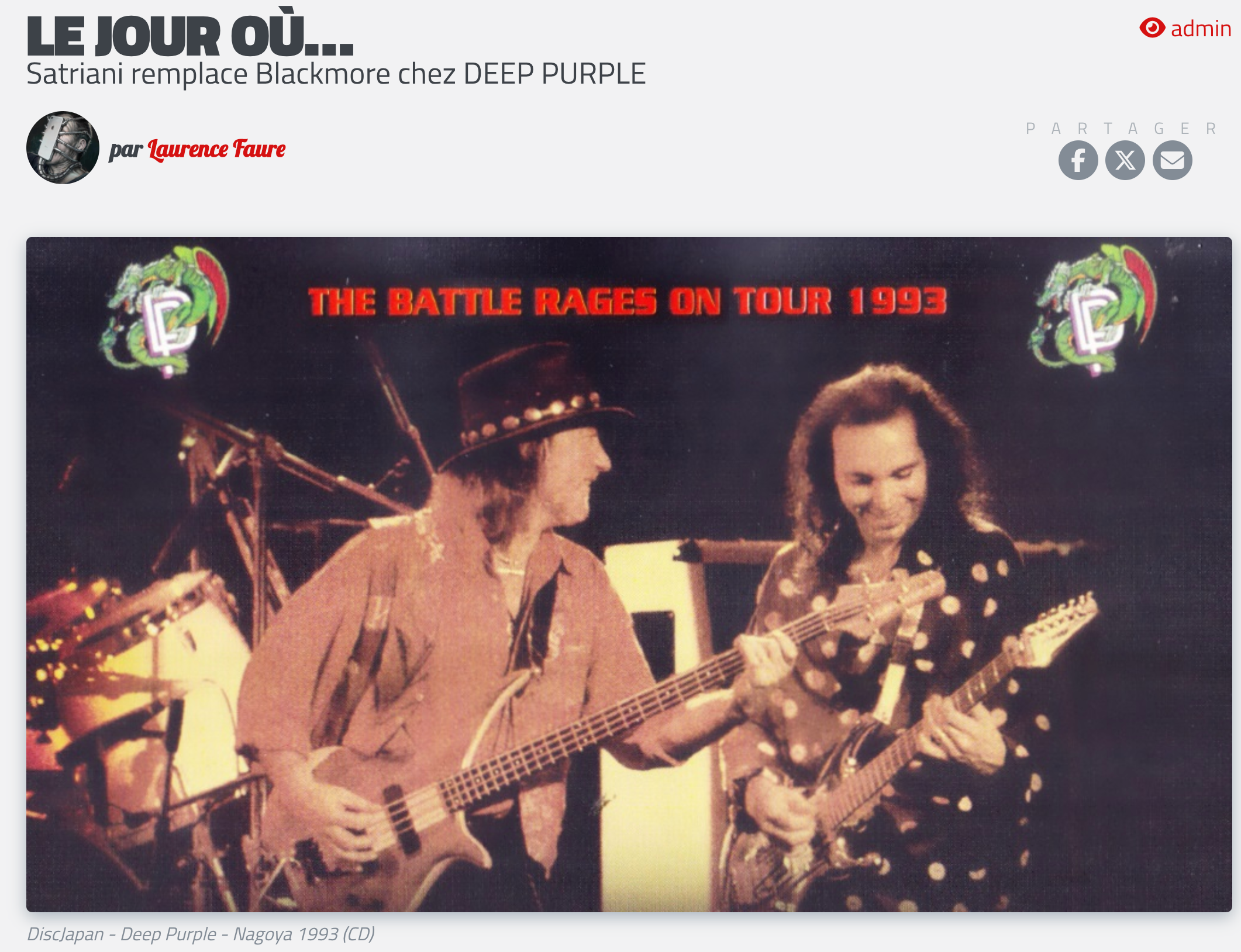 Charité bien ordonnée commence par soi-même, dit-on. A l'occasion, je dépoussiérerai quelques sujets rédigés de mes blanches mains et que vous n'aviez peut-être pas lus/vus à l'époque. Ou que vous avez oubliés. Comme le jour où Joe Satriani a remplacé son héros, Ritchie Blackmore, au sein de DEEP PURPLE. Pour accéder à l'article, cliquez sur la photo. Vous y êtes.