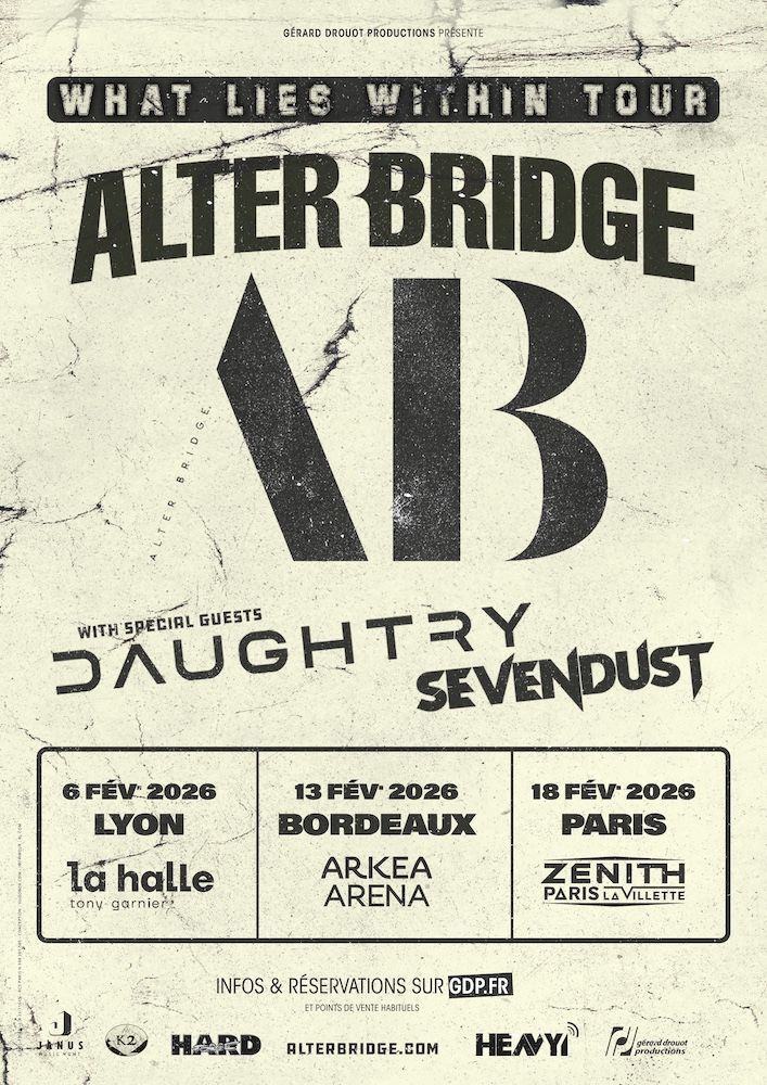 Retrouvez SEVENDUST en première partie des 3 dates française d'ALTER BRIDGE avec DAUGHTRY en partenariat avec HARD FORCE et HEAVY1, le 6 février à Lyon (Halle Tony Garnier), le 13 à Bordeaux (Arkea Arena) et le 18 février au Zénith de Paris.