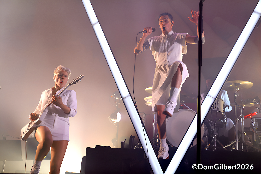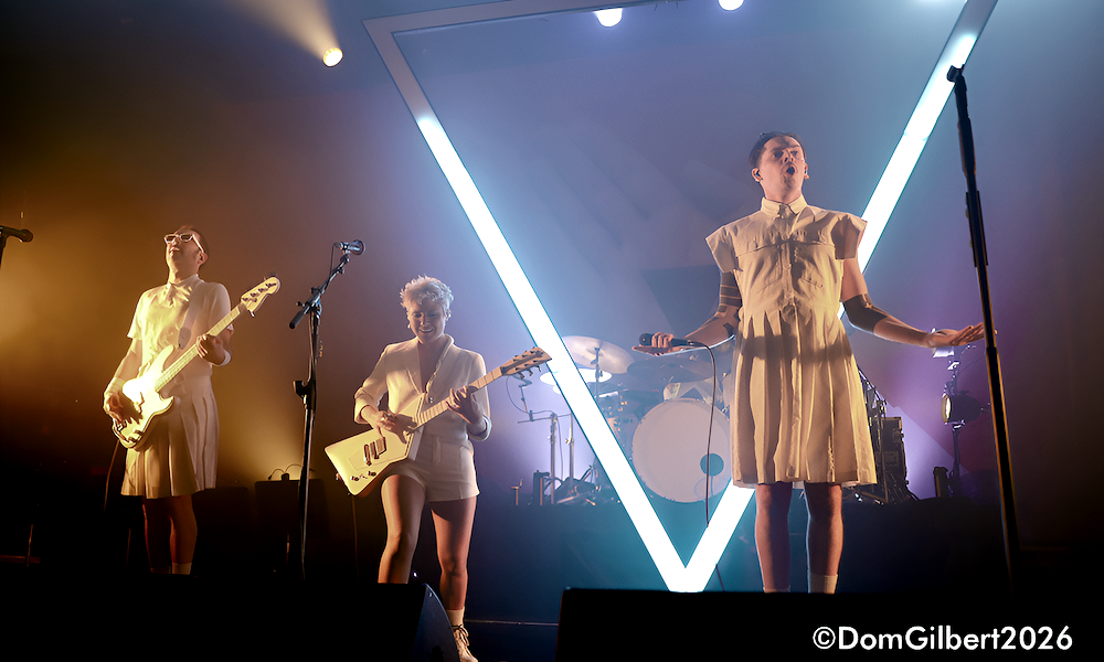 Il est 21 heures lorsque les cinq musiciens investissent la scène, décorée d’un superbe triangle lumineux. Ils respectent tous un code couleur, le blanc, symbole de pureté et d’innocence. Sauf qu’ils sont tous en robe ! A l’exception de la guitariste, Alice Animal, qui arbore pour sa part un short et une veste, blancs évidemment.