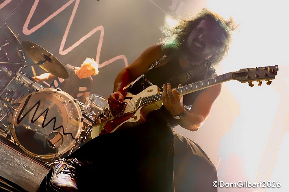 Un public bien chauffé par la première partie, le trio HOWARD, lui aussi passé par le dernier Hellfest. Son troisième album, « Oscillations » (2025), a surpris à cause de son virage electro. Mais sur scène, le groupe met les potards à fond. Le chanteur, Jimbo Canoville, en robe (décidément) et mèches bleues), mène la troupe durant 40 minutes, maître d’orchestre d’un rock psychédélique gorgé de fuzz.