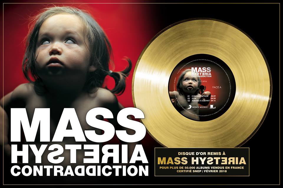 « Contraddiction » = consécration. Le deuxième album de MASS HYSTERIA paru en 1999 vient d’être certifié disque d'or avec plus de 50 000 exemplaires vendus en France. Il rejoint le club très fermé des groupes tricolores ayant reçu la même récompense : TRUST, WARNING, NO ONE IS INNOCENT et SILMARILS.