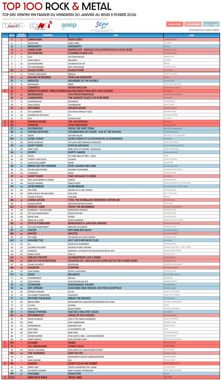 En partenariat avec le SNEP et la SCPP, ainsi que notre confrère ROLLING STONE FRANCE, HARD FORCE et HEAVY1 vous proposent le TOP 100 ROCK & METAL.
