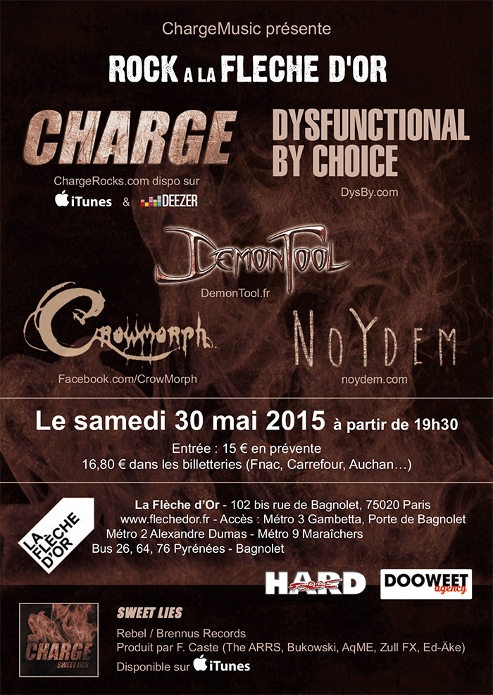 A l'occasion de la sortie de "Sweet Lies", CHARGE se produira à la Flèche d'Or le samedi 30 mai 2015 avec DYSFONCTIONAL BY CHOICE, CROWMORPH et DEMON TOOL. Billetterie en suivant ce lien
