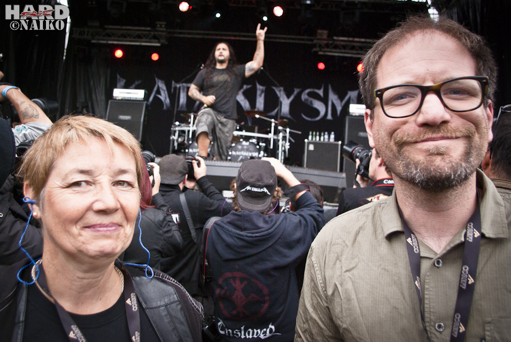 Nadine Le Goff-Carnec, maire de Saint-Nolff, et Yann Le Baraillec, président du Motocultor, n’ont pas hésité à descendre dans le pit, au milieu des photographes, sous les slammers, pendant le set dantesque de KATAKLYSM, pour nous le demander gentiment : mobilisez-vous !