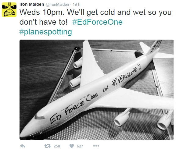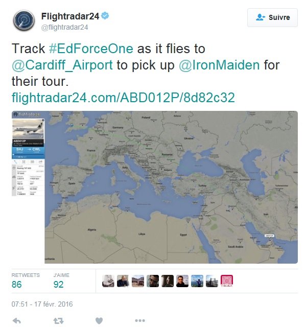 Cette nuit à minuit heure locale (1h à Paris), vous pourrez suivre en direct sur Twitter et Periscope l’arrivée à l’aéroport de Cardiff du nouvel Ed Force One cuvée 2016, un Boeing Jumbo 747-400. L’arrivée était prévue pour 22 h mais le groupe a annoncé sur les réseaux sociaux (Facebook, Twitter et Instagram) un retard d’au moins deux heures. Soyez à l’écoute des dernières nouvelles en leur provenance afin de vous assurer de l’horaire exact. Il est possible de suivre dès à présent sur Twitter l'avion en route pour Cardiff en allant sur la page Flightradar24.