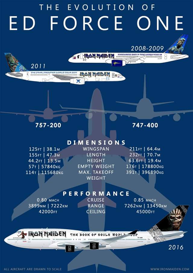 Bruce Dickinson a, pour l’occasion, suivi un stage de mise à niveau afin de pouvoir piloter ce nouvel avion et transporter le groupe, l’équipe technique et tout le matériel de tournée. Ce mastodonte est deux fois plus gros que celui utilisé sur les tournées de 2008 et 2011, un 757-200. Contrairement aux fois précédentes, Ed Force One sera utilisé en Europe pour quelques dates et il est vraisemblable qu’il vienne se poser sur le tarmac de Roissy.