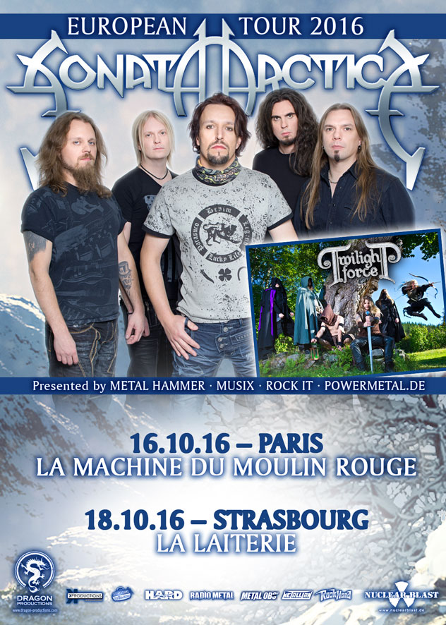 C'est le 12 février dernier qu'annonçait le groupe SONATA ARCTICA la préparation d'une tournée européenne accompagné en première partie de TWILIGHT FORCE. Outre la Norvège, Suède, Danemark, Allemagne, Pays-Bas et Royaume-Uni, cette tournée passera par la France le 16 octobre à Paris (La Machine du Moulin Rouge) et le 18 octobre à Strasbourg (La Laiterie). Puis les Finlandais iront en Suisse puis en Italie avant de remonter vers l'Allemagne. L'occasion de retrouver quelques titres de « Pariah's Child » ainsi que les classiques du groupe.