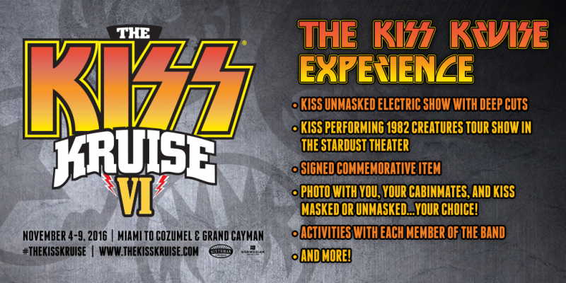 Alors qu'il n'y a toujours pas de nouvelles d'une hypothétique tournée européenne ou d'un remplacement des dates annulées en Allemagne, KISS annonce la KISS Kruise VI du 4 au 9 novembre 2016. En 2011, les quatre garnements ont initié la mode de la croisière rock (à quand le tour en camping-car?), à raison d'une par an, nous en sommes donc à la sixième. Côté line-up, le capitaine promet d'inviter nombre de ses artistes favoris (enfin, au moins une douzaine), mais pour le moment, point de noms avancés. Parmi les invités notables, la KISS KRUISE V s'était offert la présence de STEEL PANTHER, ce qui laisse augurer de prochains invités sympathiques.