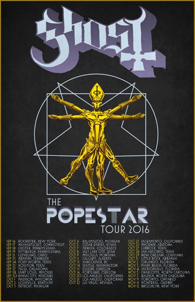 Papa Emeritus III et ses Ghouls ne s'arrêtent plus ! Un show spécial de GHOST est prévu ce dimanche au Hellfest et le groupe vient d'annoncer une tournée américaine de 35 dates à partir de septembre en tête d'affiche. Deux rituels dans la salle The Wiltern à Los Angeles auront lieu en octobre. L'achat de billets pour certains shows donnera lieu à un téléchargement de nouveaux titres disponibles cet automne. Le groupe a finalisé un nouvel EP, produit par Tom Dalgety, pour une sortie à la rentrée chez Loma Vista.