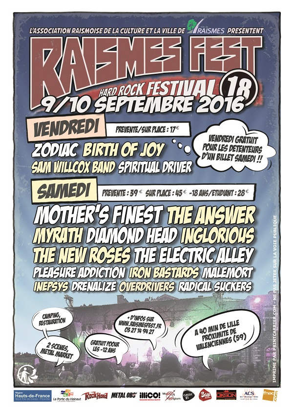 Ce moyen à un nom : RAISMES FEST ! Le festival se tient chaque année et aura lieu pour cette 18ème édition les 09 et 10 septembre et bénéficiera d’une programmation majeure (18 ans oblige !). Des noms ? Ok : MOTHER’S FINEST en tête d’affiche le samedi soir (Bim !) mais aussi THE ANSWER (Bam !) ou MYRATH, DIAMOND HEAD ou INGLORIOUS (Boum !). Le premier jour accueille moins de groupes (ZODIAC et BIRTH OF JOY en tête) mais est un moyen de se mettre dans l’ambiance tranquillement. (voir la totalité des groupes sur l'affiche plus bas).