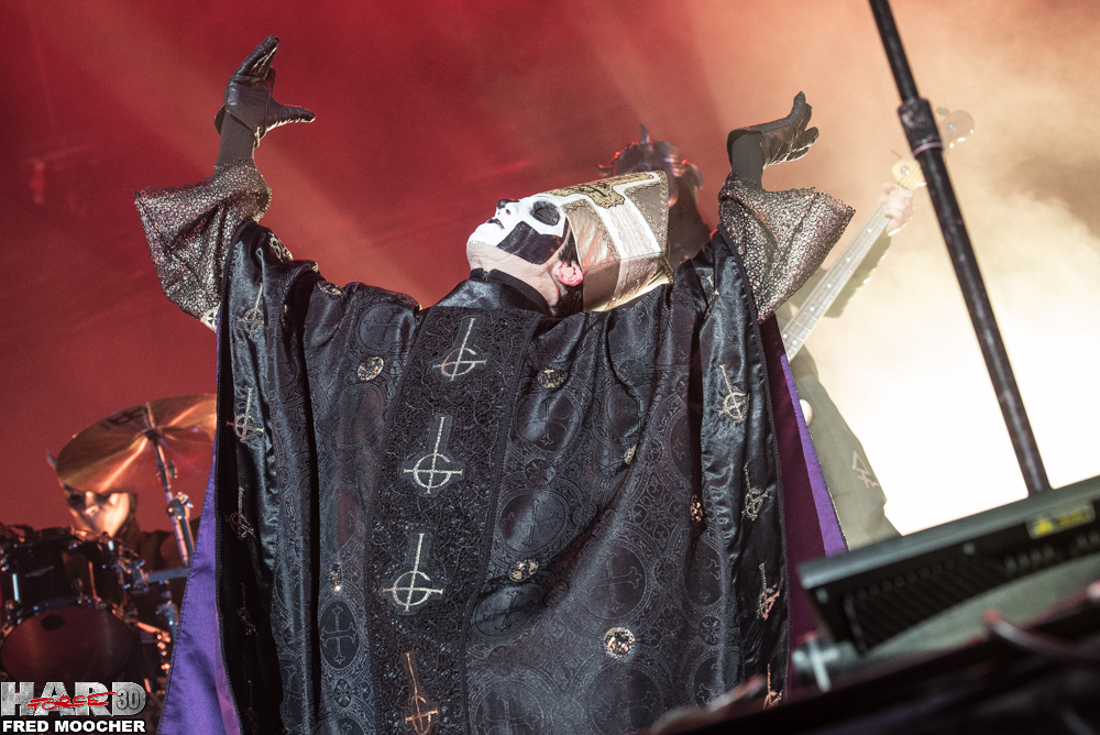 Il reste donc seulement trois plus anciens morceaux avec "Body And Blood", "Year Zero" et "Monstrance Clock", sur lequel apparaît une chorale d’enfants, même si je ne suis pas certain qu’ils chantaient vraiment micro bien ouverts, tant ce qu’on entendait était identique au disque, avec des voix entremêlées. Mais c’est une belle initiative et un véritable tour de force ; car je ne sais pas si on leur a expliqué les paroles qu’ils chantaient, ces gamins ! Avant le morceau, Papa (dont c’est un peu la fête aujourd’hui) explique longuement qu’au Moyen Age, période d’obscurantisme, l’orgasme féminin était interdit, car assimilé au diable. Alors aujourd’hui, ils vont chanter en l’honneur de ce dernier qui peut parfois atteindre le sublime lorsqu’il survient en même temps que celui de son partenaire ! Les enfants ont donc chanté « Come Together (jouissons ensemble), Together as One (ensemble ne faisons qu’un), Come Together (jouissons ensemble) For Lucifer’s son (pour le fils de Lucifer) ». Comment dire… Les chrétiens intégristes farouchement opposés au Hellfest n’ont pas relevé ça ? La jeunesse, l’enfance clissonnaise, à ce point pervertie ? Bravo GHOST, félicitations, vraiment ! Cela valait bien quelques feux d’artifice pour un final de toute beauté. Et non, la soirée n’est pas encore finie !