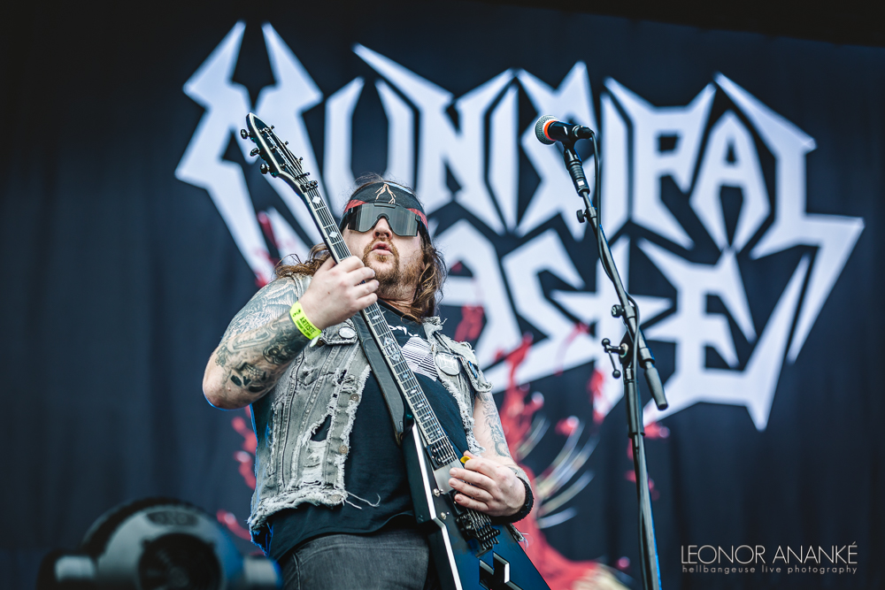 Si j’évoquais hier MUNICIPAL WASTE (qui passent juste après NIGHTMARE sur l’autre Mainstage), dans mon compte-rendu du concert de TWISTED SISTER, en rapport avec Donald Trump ("We’re Not Gonna Take It" étant jouée en ouverture de chacun de ses précédents meetings… plus maintenant, à la demande de Dee Snider), c’est pour une bonne raison : le backdrop du groupe représente le Républicain se tirant une balle dans la tête ! Inutile de dire combien leur amour envers ce politicien est grand, ils lui ont d’ailleurs concocté un morceau grindcore (c’est-à-dire d’une durée inférieure à vingt secondes !) calqué sur celui de 2003 déjà dédié à l’époque à Georges Bush : "I Want To Kill The President". Avec en préambule un mini-discours dans lequel ils assurent : « On n’est pas tous des idiots racistes aux États-Unis ! ».