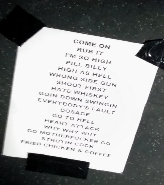 Sur la fin du concert, Blaine indique qu’ils jouent ce soir dans une ville où il n’y a rien à faire le soir et que le public pourra les retrouver après le show au stand de merchandising pour signer quelques merdes (sic) et boire des coups toute la nuit.