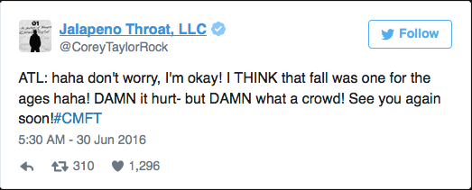 * Atlanta : ah ah, ne vous en faites pas, tout va bien ! J'ai pris une de ces pelles, ah ah! PUTAIN j'ai mal - mais PUTAIN, quel public ! A bientôt ! #CMFT (Corey Mother Fuckin' Taylor)