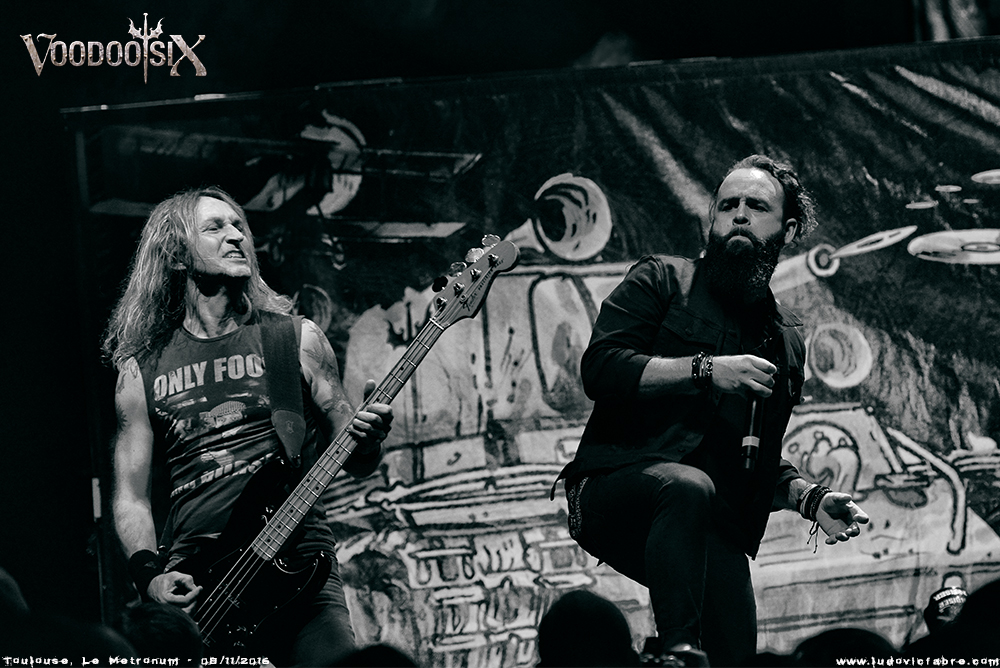 Cette fois, c’est au tour de VOODOO SIX de démarrer la soirée : ils ont déjà ouvert pour IRON MAIDEN en 2013 sur le "Maiden England World Tour", ceci expliquant cela. A noter que le groupe a été formé en 2003 par le bassiste Tony Newton et un certain Richie Faulkner, qui officie désormais au sein de JUDAS PRIEST ! Son heavy rock mélodique délivré par de très bons musiciens (avec de sérieux riffs !), notamment un chanteur survolté, ne tarde pas à prendre. Alors certes, ce n’est pas la folie dans la salle, mais le public est réceptif et semble apprécier le vrombissement de ce puissant V6, d’autant plus que les musiciens se donnent sans retenue. "Lead Me On", par exemple, fait partie de ces morceaux qui donnent irrémédiablement envie de taper du pied et dodeliner de la tête en cadence (à défaut de headbanger sauvagement !). Depuis « Songs To Invade Countries To » de 2013 (dont les belles illustrations de guerriers-musiciens ornant les backdrops n’auraient pas déplu aux graphistes du Hellfest !), le groupe n’a rien sorti, mais un nouvel album arrive en février prochain dont un titre sera joué ce soir, en hommage aux victimes du Bataclan. Même si le style est assez classique, VOODOO SIX a du talent à revendre et a pleinement rempli son rôle ce soir.