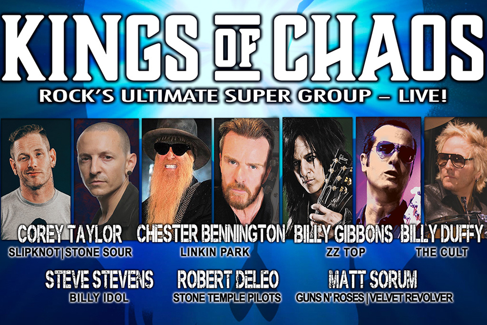 Le 1er décembre, KINGS OF CHAOS donnait le premier de ses trois concerts au House Of Blues de Las Vegas. Pour mémoire, sous ce nom se cache un collectif 100 % premium au line-up changeant réunissant actuellement Corey Taylor (SLIPKNOT, STONE SOUR) et Chester Bennington (LINKIN PARK) au chant, Billy Gibbons (ZZ TOP), Steve Stevens (Billy Idol) et Billy Duffy (THE CULT) aux guitares, Matt Sorum (ex-GUNS N’ROSES, VELVET REVOLVER) à la batterie et Robert DeLeo (STONE TEMPLE PILOTS) à la basse.