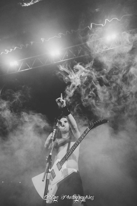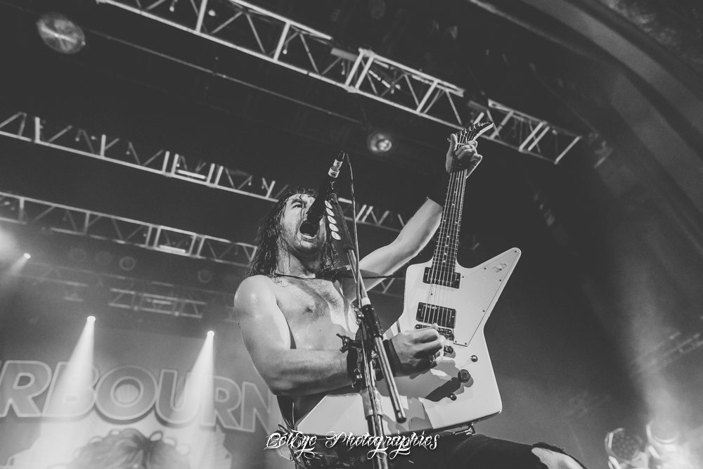 On poursuit avec "Too Much, Too (ndr : Angus ?) Young, Too Fast" et « Chewin’ The Fat », toutes deux enchaînées avant que Joël O’Keefe ne salue l’assistance extatique et lui présente un morceau du dernier album en date, "Rivalry". Très bon titre et grosse torgnole. C’est sur cette chanson que le premier backdrop flanqué uniquement du logo du groupe tombe et fait place à un second représentant la pochette dudit album. Effet ! On se croirait chez IRON MAIDEN, tiens. En tout cas, c’est sympa comme tout et, en contraste avec le minimalisme de la production, fait plaisir à voir. Alors ne boudons pas notre plaisir. Sur "Girls In Black", le joyeux jojo Joël descend faire un tour dans la fosse juché sur les épaules de Bon Scott. Ah non, merde ! Ce n’est qu’un roadie. Désolé mais comme j’ai déjà vu ce gimmick chez AC/DC, mon clavier s’est emballé. Mes excuses aux familles tout ça… Et en prime, première explosion de canette sur le crâne et offrande aux soiffards présents. "It’s All For Rock 'n' Roll" est l’occasion de rendre hommage à l’icône qu’est devenue le regretté chanteur de MOTÖRHEAD, Lemmy, lui qui n’était « qu’une légende » de son vivant. Il doit bien se marrer là-haut, lui qui se considérait juste comme un musicien. Qu’importe, il le mérite bien. Et le chanteur torse nu de rappeler que l’ami Lemmy a bien œuvré pour l’essor d’AIRBOURNE. Rendons à (Hail) Caesar ce qui appartient à Lemmy.
