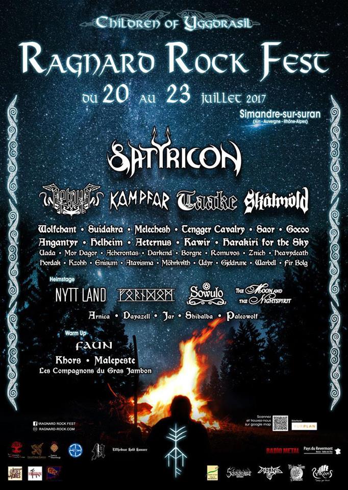 Du jeudi 20 juillet au dimanche 23 juillet 2017, se tiendra la 3e édition du RAGNARD ROCK FEST sur les terres de Simandre sur Suran. Premier festival pagan européen et plus grande manifestation de reconstitution historique médiévale pré-chrétienne de France, il accueillera sur ses 3 scènes des groupes aussi variés que SATYRICON, KAMPFAR, FORNDOM, MÖHRKVLTH, FAUN ou GJELDRUNE.