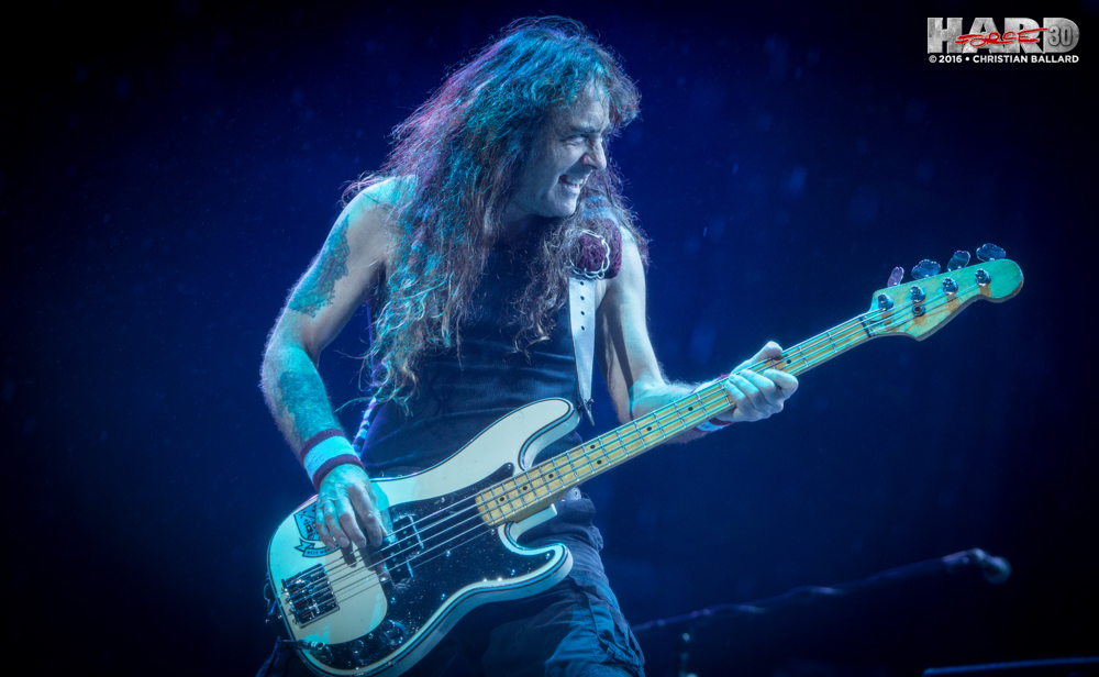 C’est comme d’habitude sur les premières notes du "Doctor, Doctor" d’UFO que le public se déchaîne, lui qui sait alors que 4 mn 30 seulement le séparent désormais de l’arrivée d’IRON MAIDEN. Lorsque les lumières s’éteignent et que les bâches recouvrant le décor sont retirées, les écrans géants latéraux lancent le film d’intro. Belle surprise, car c’est une nouvelle animation complètement différente de l’an dernier qui se révèle à nos yeux. Le chaudron fume, la nappe de claviers résonne et Bruce Dickinson fait son apparition, juché au-dessus de la batterie de Nicko McBrain. « Here is the soul of a man… » Les frissons parcourent l’échine, l’audience se veut presque recueillie, tout en étant prête à exploser. Quand débarque le reste du groupe, les 20 000 personnes présentes clament bruyamment leur approbation et la joie de revoir le groupe. A "If Eternity Should Fail" succède "Speed Of Light" qui, comme l’an dernier, constitue une doublette d’entrée impeccable. C’est ensuite à la vitesse de la lumière que nous revenons en 1981 pour le premier classique de la soirée, "Wrathchild" qui, bien que prévisible dans les changements annoncés avant le début du tour, fait toujours son effet sur le public qui n’en demande pas tant pour donner de la voix, à l’instar de Steve Harris venant haranguer les fans au plus près afin de les faire participer.