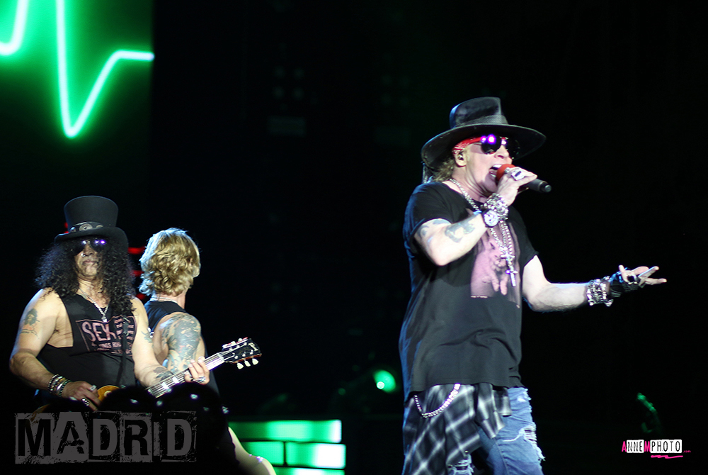Madrid, 4 juin, Estadio Vicente Calderon, on remet ça. Même contenance pour le stade mais avec des tribunes. Tyler Bryant AND THE SHAKEDOWN s'acquittent à nouveau à merveille de la première partie et l'on se prépare avec quelques a priori au set de Mark Lanegan qui finalement sera bien meilleur qu'à Lisbonne. Niveau ambiance, si les Lisboètes étaient assez candides, les Madrilènes sont déchaînés et scandent le nom du groupe à la manière de "Get In The Ring" à tel point qu'on les verrait bien faire une entorse à la tradition et commencer par ce titre. Loupé, ce sera "It's So Easy". Axl est complètement déchaîné. Le "Welcome To The Jungle" est apocalyptique. Si on pensait qu'il avait tout donné au niveau de la voix à Lisbonne, on s 'était lourdement fourvoyé. « You know where you are ? You're in the Jungle baby ! ». Aucun doute, on y est. Si Slash s'est surpassé au Portugal et délivre ici une excellente prestation, Madrid restera la date d'Axl. Sa voix a gagné en rondeur et en puissance, ce qui semble incroyable tellement le set de Lisbonne était bon. Il ne court plus, il vole d'un point à l'autre de la scène et Slash fait des bonds partout. On était prévenus, mais on reprend une énorme claque.