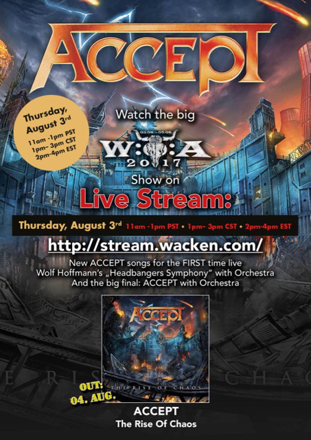 « The Rise Of Chaos », le nouvel album d’ACCEPT sort demain vendredi 4 août chez Nuclear Blast Records et le groupe se produit ce soir au Wacken Open Air Festival pour un concert de 2h et en trois parties, qui s’annonce d’ores et déjà historique et en plus diffusé en streaming de 20h à 22h.