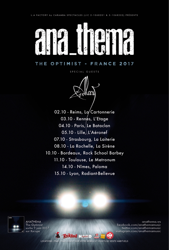 Après avoir commencé sa tournée pour la promotion de « The Optimist » en Russie, en Amérique latine puis en Amérique du Nord, ANATHEMA démarrera ses prochaines dates européennes à Glasgow le vendredi 22 septembre. C'est pas moins de 10 dates qui se dérouleront en France, voir l'affiche ci-dessous, sans oublier une date à la Kulturfabrik d'Esch-sur-Alzette au Luxembourg pour laquelle HARD FORCE est aussi partenaire le 18 novembre (concours prochainement). Le groupe sera accompagné des Français ALCEST sur toutes les dates de la tournée.