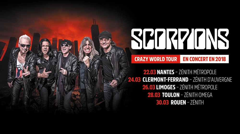 Le groupe SCORPIONS sera en concert dans l’Hexagone pour 5 dates au printemps prochain afin de faire revivre la tournée de l’album « Crazy World » paru originellement en 1990. Le Crazy World Tour sera donc l’occasion d’applaudir encore une fois les Allemands qui ne se décident toujours pas à raccrocher les gants, pour le plus grand bonheur de leurs fans. En parallèle, leur nouveau best of intitulé « Born To Touch Your Feelings – Best Of Rock Ballads » paraîtra le 24 novembre 2017.