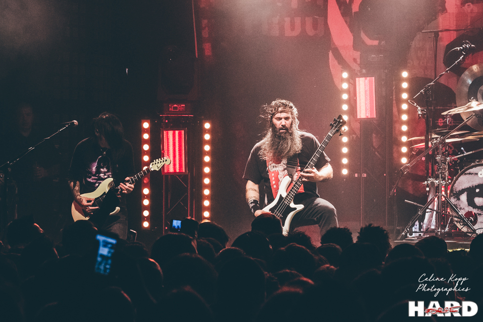 Une pluie de confettis et de serpentins donne le ton festif de la soirée. Puis le concert se poursuit avec les frénétiques "Made Of Scars" et "Reborn" et la fosse se déchaîne. La chaleur est déjà moite et étouffante et les gosiers se dessèchent à force de chanter-brailler-hurler à tue-tête. Et ce n’est pas "Say You’ll Haunt Me" ni l’incontournable "30/30-150" qui feront redescendre la fièvre qui s’est emparée de la salle remplie jusqu’à la gueule de fans affamés. "Hesitate" sera le titre un peu mou-du-genou de ce concert. Pas franchement indispensable. Mais l’effet bof sera de courte durée car le groupe enchaîne sur le génialissime "Tired" et son riff de guitare imparable. LE titre le plus attendu par une bonne partie du public, issu du non moins génial « House Of Gold And Bones-Part 1 ». A noter au passage que le sieur Corey est fort bien entouré : Roy Mayorga est un extraordinaire batteur qui martyrise ses fûts toute la soirée, Josh Rand, discret mais indispensable bras droit, nous laisse pantois devant tant de perfection, le bassiste Johny Chow a une puissance de son et une présence indiscutable et le guitariste Christian Martucci délivre des soli ciselés avec précision.