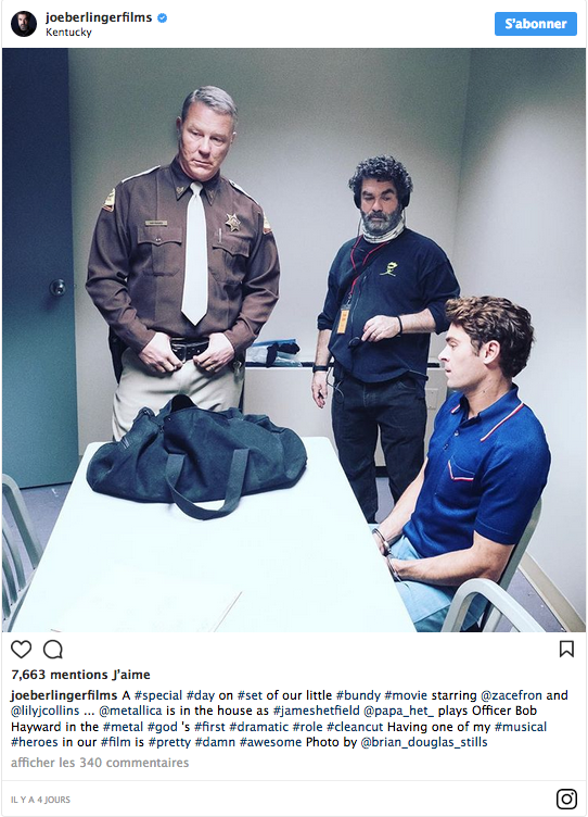Man in uniform. Après avoir fait quelques apparitions subliminales dans son propre rôle, y compris dans l’excellent et sous-estimé Through The Never, James Hetfield a décroché son premier “vrai” rôle au cinéma. Dans Extremely Wicked, Shockingly Evil, And Vile, qui raconte l’histoire de Ted Bundy, joué par Zac Efron (vu dans The Greatest Showman In The World), il interprète l’officier Bob Hayward qui arrêta le serial killer violeur et nécrophile. Qui conserv chez lui la tête de certaines de ses victimes. Le réalisateur n’est autre que Joe Berlinger à qui l’on doit Some Kind Of Monster, documentaire consacré à METALLICA commercialisé en 2004. Pour l’instant, aucune date de sortie n’est annoncée mais voici en tout cas la première photo officielle de Papa Het version représentant de l'ordre. « Avoir un de mes héros dans notre film est vraiment génial » commente Berlinger sur son compte Instagram… On confirme.