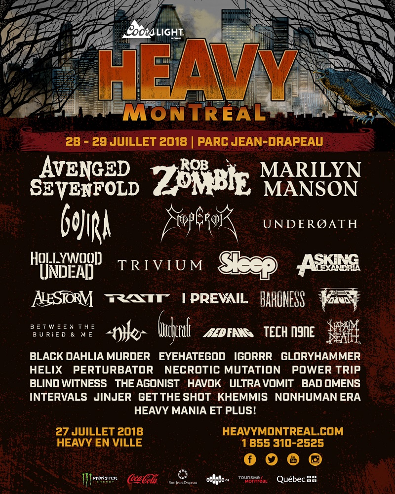 Le festival québécois HEAVY MONTREAL vient de révéler son affiche avec, une fois encore, du beau linge pour ces deux journées qui sont programmées les 28 et 29 juillet au Parc Jean Drapeau. Y joueront notamment AVENGED SEVENFOLD, ROB ZOMBIE, MARILYN MANSON ainsi que nos compatriotes GOJIRA, IGORRR et les trublions d’ULTRA VOMIT. Vous pouvez retrouver le reste des groupes sur le flyer en fin d’article.