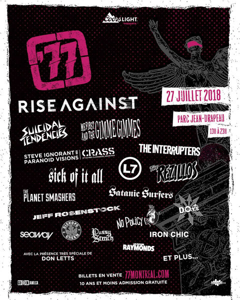 Et pour la deuxième année consécutive se tiendra en préambule le 27 juillet, toujours au Parc Jean Drapeau, le festival ’77 MONTREAL plus axé sur le hardcore et punk rock, et qui verra s’y produire RISE AGAINST, SUICIDAL TENDENCIES, SICK OF IT ALL ou L7 par exemple.