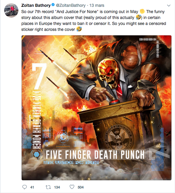 En 1988, METALLICA baptisait son quatrième album d’un ironique « …And Justice For All ». Trente ans plus tard, FIVE FINGER DEATH PUNCH a choisi de nommer sa septième réalisation « And Justice For None » (et la justice pour personne). Annoncée pour le 18 mai, elle fait déjà parler d’elle puisque la pochette serait, paraît-il, déjà en passe d’être censurée dans certains pays européens, comme l’a annoncé Zoltan Bathory, guitariste et cofondateur du groupe, sur son compte Twitter. Ça doit être son petit doigt qui le lui a dit car on ne voit pas trop ce qu’il y a de choquant…