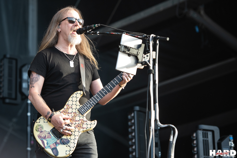 Attendu comme à chaque fois, MEGADETH, qui est présent à intervalles réguliers à Clisson et une valeur sûre de la programmation, va être cette fois le pire concert auquel j’ai assisté lors de cette édition. Dès le départ, le son est mauvais et un problème de sono entache la prestation. Lorsque les musiciens se font enfin entendre en façade, c’est un chant fade qui en sort avec le pire Dave Mustaine qu’il m’ait été permis d’entendre à ce jour. Dommage car la set-list contient de belles surprises avec ''The Conjuring'', ''My Last Words'' (dédiée à Vinnie Paul) ou encore ''Symphony Of Destruction'' qui voit Michael Amott, le guitariste d’ARCH ENEMY, venir taper le bœuf. MegaDave ne profite même pas de l’heure pleine qui est à la disposition de son groupe et sort de scène après seulement 50 minutes, laissant tout le monde sur sa faim et avec une indigestion sur ce que l’on nous a fait avaler. Performance vite oubliée et balayée par la tempête déclenchée par ALICE IN CHAINS. C’est bien simple, la formation de Seattle aligne hit sur hit sans coup férir ni pause. Ça défile à toute allure en démarrant par ''Bleed The Freak'' ou encore une très émouvante et sublime version de ''Nutshell'' dédiée elle aussi au disparu du week-end et où l’album de référence « Dirt » est le mieux représenté avec quatre extraits, dont un ''Rooster'' lourd, très lourd en guise d’au revoir. Messieurs, revenez quand vous voulez et autant de fois que vous le souhaitez !