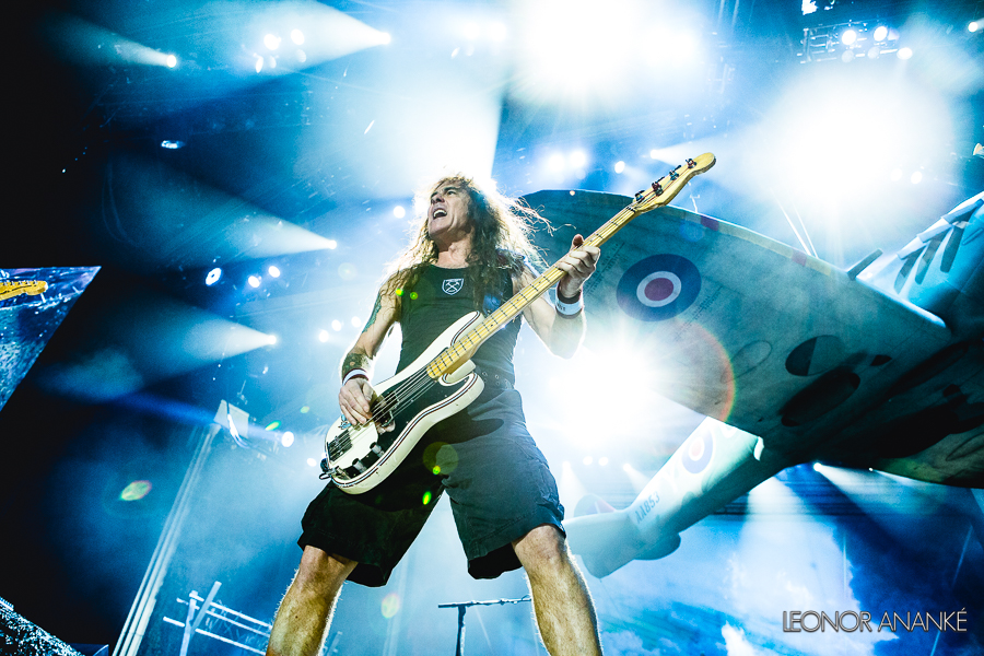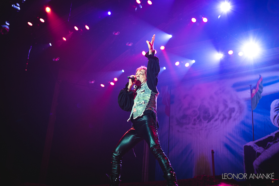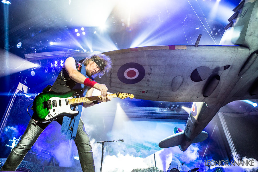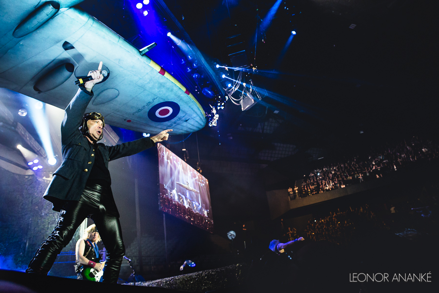 En effet, à peine 30 minutes plus tard résonne (enfin !) ''Doctor Doctor'' d’UFO qui prévient les spectateurs que ce ne sont plus que 4 minutes et 12 secondes précisément qui les séparent de la déflagration tant attendue. La salle s’éteint et les écrans lancent un film d’intro sur lequel des images de guerre et d’avions de la RAF défilent tandis que débute ''Churchill’s Speech'', prélude immuable en live au premier titre de la soirée, ''Aces High''. Le groupe arrive en courant sur scène et un avion modèle Spitfire (gonflable mais bluffant de réalité) survole le groupe alors que le public explose de joie. Divisée en trois parties ne la confinant donc pas tout à fait à une setlist "best of", le "Legacy Of The Beast World Tour 2018" se concentre donc en premier sur le thème de la guerre avec, ensuite, ''Where Eagles Dare'' où Bruce Dickinson est affublé d’une chapka et d’un coupe-vent blanc afin de coller au thème de la haute montagne. Ce morceau de 1983, inspiré du film Quand les Aigles attaquent et issu de « Piece Of Mind » (album mis à l’honneur avec pas moins de quatre morceaux sur neuf joués sur le tour) ne laisse aucun répit avant l’arrivée de ''2 Minutes To Midnight'' (que le groupe ne joue jamais à 23h58 cela dit) et surtout, ''The Clansman''. Là, les choses sérieuses commencent vraiment pour ainsi dire car c’est un titre rare et si Bruce avait promis une setlist surprenante et que l’homme s’emballe un peu souvent dans la presse, on a tendance à le croire à ce moment précis. Interprétation sans faille avec un « petit danse fou » dixit le facétieux chanteur qu’on croirait atteint par la danse de Saint-Guy et la participation vocale du public qui donne tout ce qu’il a alors que le concert vient seulement de commencer ou presque. ''The Trooper'', avec l’arrivée du soldat Eddie (bien défiguré cette année) venant défier au sabre l’ancien épéiste est un autre moment fort qui est l’occasion pour Bruce de s’emparer du drapeau français afin de tirer sur Eddie (oui, chez IRON MAIDEN les drapeaux sont des armes à feu déguisées).