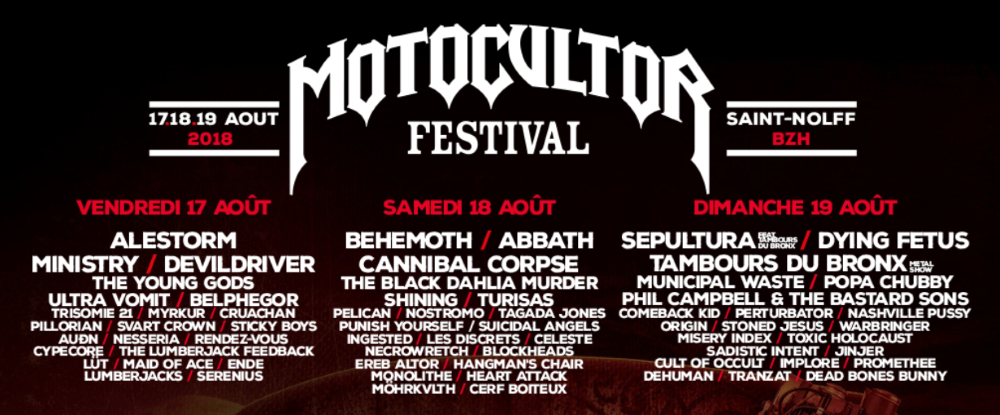 Plus de temps à perdre donc, vous pouvez désormais organiser votre programme personnel pour ce nouveau cru. Quoi qu’il en soit, même si les festivités battront leur plein devant la prestation de BEHEMOTH à 23h15 le samedi 18 ou de SEPULTURA le dimanche 17 à 00h15, tous les deux sur la Dave Mustage, le MOTOCULTOR FESTIVAL s’étalera chaque jour sur plus d'une douzaine d’heures avec des concerts dès l'heure de l'apéro et ce jusqu'à deux heures du matin.