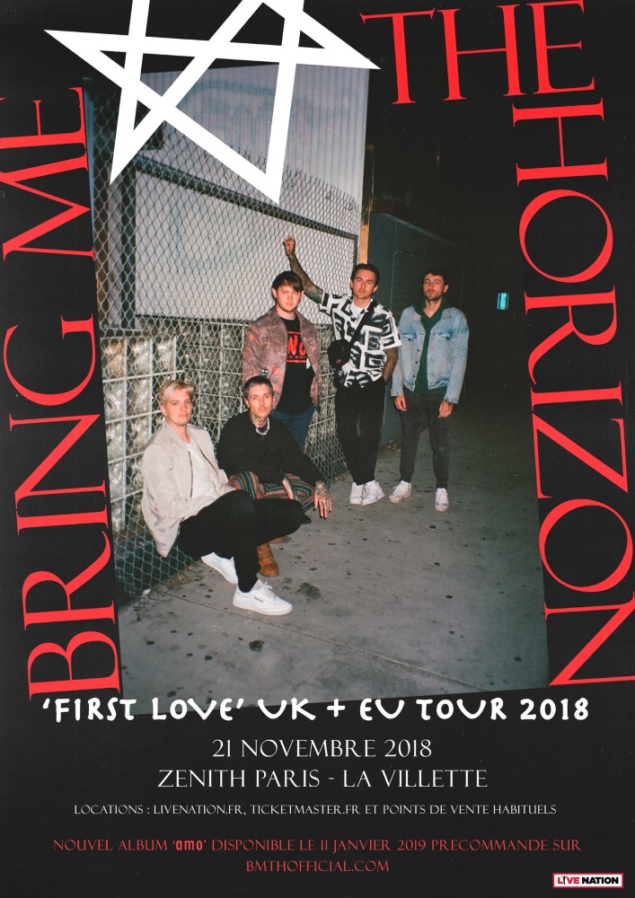 Groupe aux albums certifiés multi-platine, BRING ME THE HORIZON a annoncé la sortie de son nouvel album, intitulé « Amo », prévue le 11 janvier 2019 chez RCA pour le monde entier et Columbia/Sony Music pour les Etats-Unis, dont le premier extrait "Mantra" a été dévoilé hier (à écouter plus bas). Par la même occasion, le groupe a annoncé la tournée mondiale "First Love Tour" qui passera par Paris le 21 novembre 2018 au Zénith - La Villette.